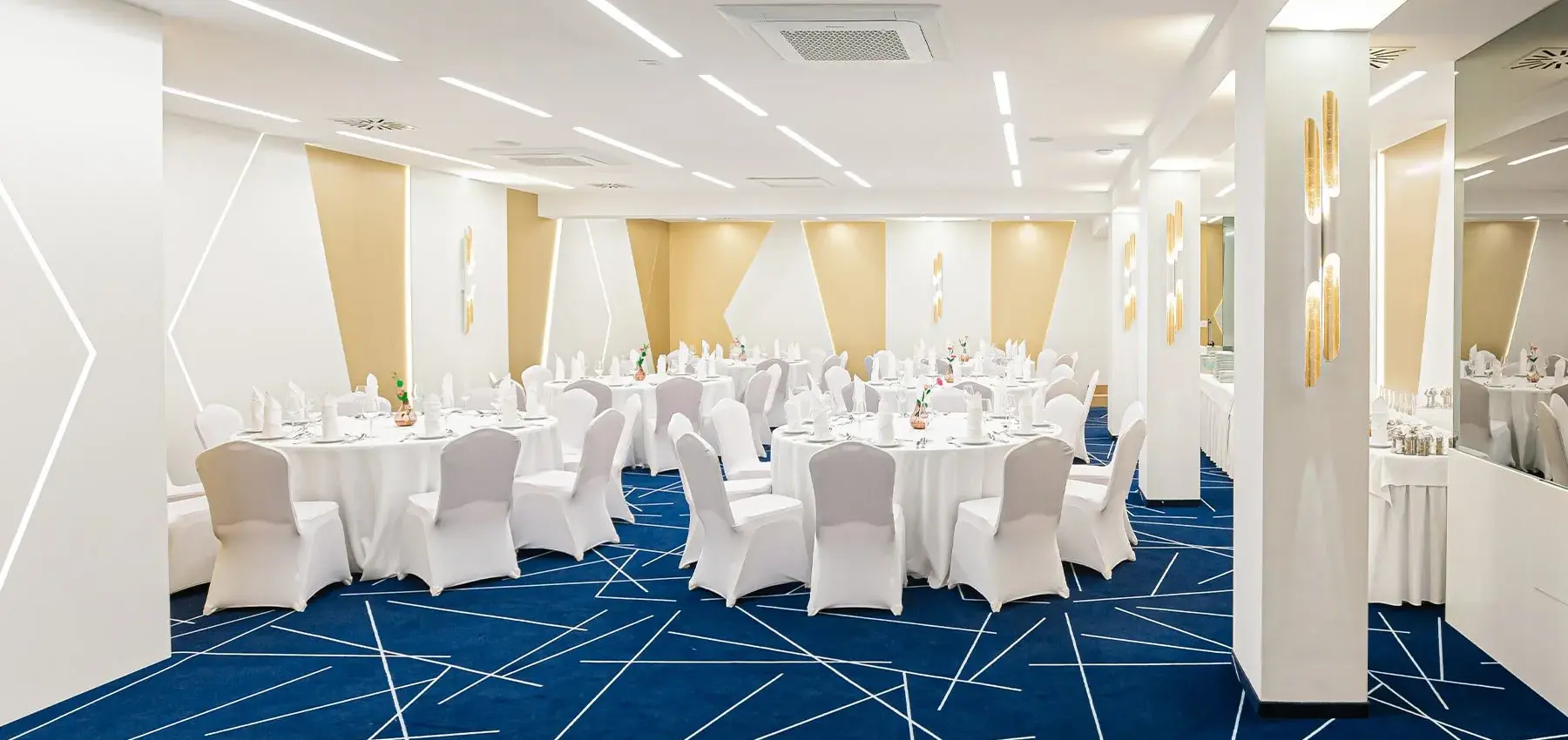 Oferujemy przestronną i komfortową salę konferencyjną mieszczącą od 150 osób przy okrągłych stołach bankietowych do nawet 220 osób w wersji kinowej. Istnieje również możliwość podzielenia sali na dwie autonomiczne części. Sala jest w pełni wyposażona we wszystkie niezbędne sprzęty, takie jak rzutniki czy mikrofony, a także klimatyzację i nielimitowany dostęp do wi-fi.
